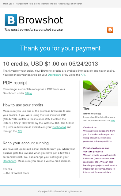 We sent our first newsletter to about 230 of users who opted in and have not used Browshot in a couple of months. We wanted to let them know much Browshot has evolved recently: faster, better reliability and many new great features such as the tight integration with S3.